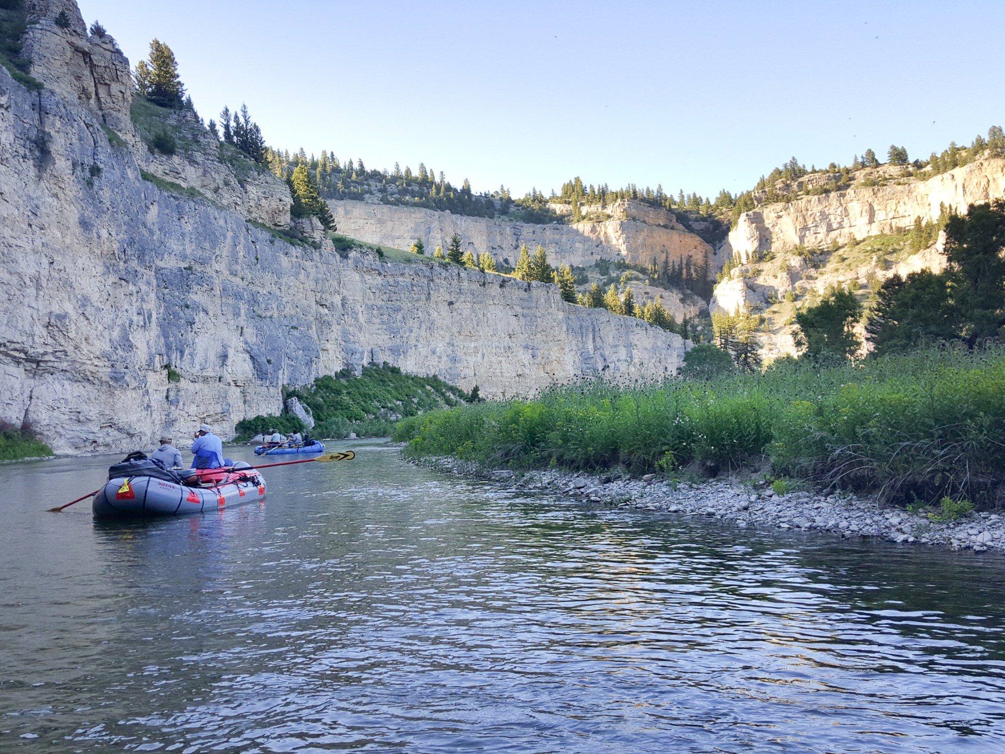We woke up Monday and Connor and I quickly got to cooking breakfast after our first cup of coffee. This morning we cooked breakfast burritos which turned out awesome. After breakfast we broke camp, loaded the boats, and got back on the water. Just below camp on river right we reached the confluence of Tenderfoot Creek, a popular tributary to fish. We passed on the fishing and continued downstream, catching an eddy below. Connor fished the dry and I opted to lob the bobber with a nymph, even in the deep pools I wasn’t able to hook up, but honestly, I don’t know what the hell im doing or even talking about. The canyon here was magnificent! Back in the boat we rowed on with heads cocked toward the sky and the overhanging limestone high above, the view was spectacular and continued to get better with every bend in the river. We continued to fish without luck which was fine by us, we had the scenery to entertain us. We passed a good camp at Canyon Depth and pressed on, it was getting damn hot and Connor and I were ready for a swim. We found a nice eddy and swimming hole at Sheep Wagon Camp so we took full advantage of it and quickly got in the water. We chilled for a while before the rest of the group caught up and joined us on the bank for a beer and a few laughs. After a while a lone boat came around the corner and the only man on the boat rowed over to see how our trip was going, he was with Montana Fish and Game and was making sure we were having a good time, nice guy, and what a sweet gig.